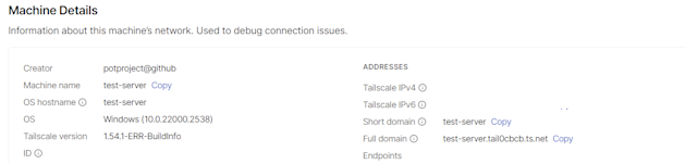 ちゃんと動作させると、MachinesとしてTailScaleの管理画面にも表示されます。Versionは1.54.1-ERR-BuildInfoになってるけどまあ普通にアクセスできるのでOK。